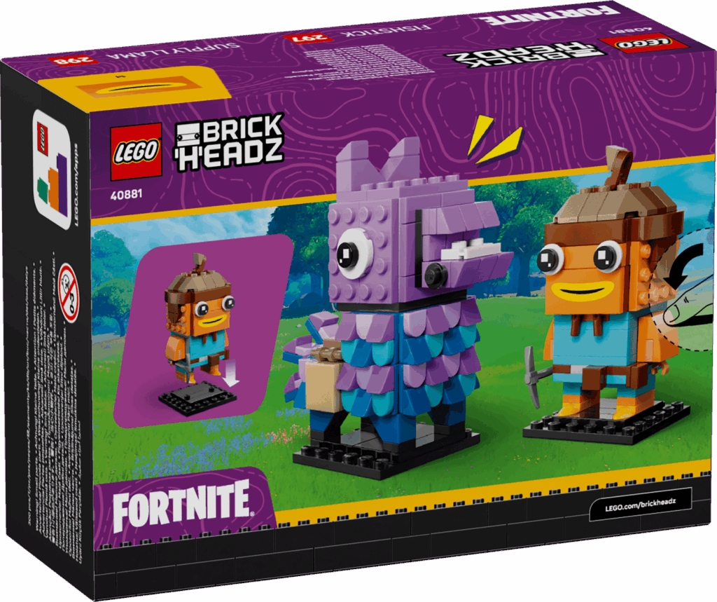 V stavebnici nájdete modro-fialovú figúrku Supply Llamy a oranžovú figúrku Fishsticka, ktorý v rukách drží doplnok v podobe krompáča. Stavebnica obsahuje 300 dielikov. Figúrka Supply Llamy meria vyše 10 cm na výšku a figúrka Fishsticka meria vyše 10 cm na výšku.